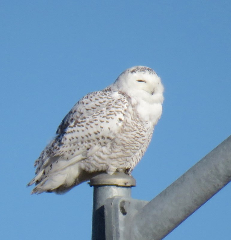 I was driving westbound on I-76 when I first saw the Snowy Owl. I exited and stopped for a while, taking some photos. The pale, large, and bulky appearance of this species is distinctive. The dark barring on the undersides and wing coverts, and the dark spots on the forehead, are typical for an immature bird. The bird was resting the entire time I watched it, only occasionally turning its head or opening its eyes. No calls could be heard above the loud traffic noise.