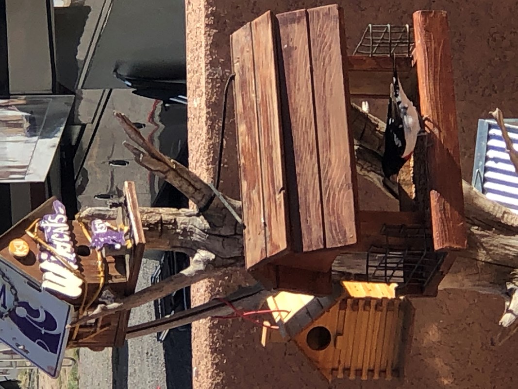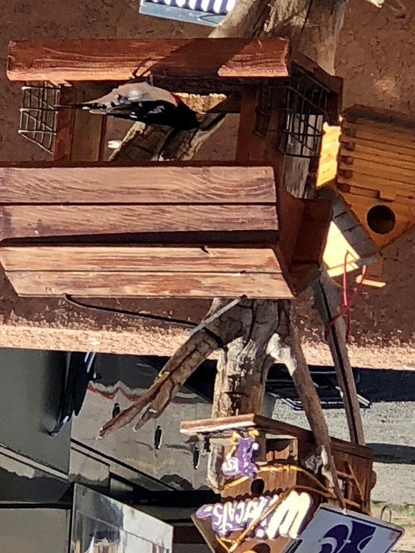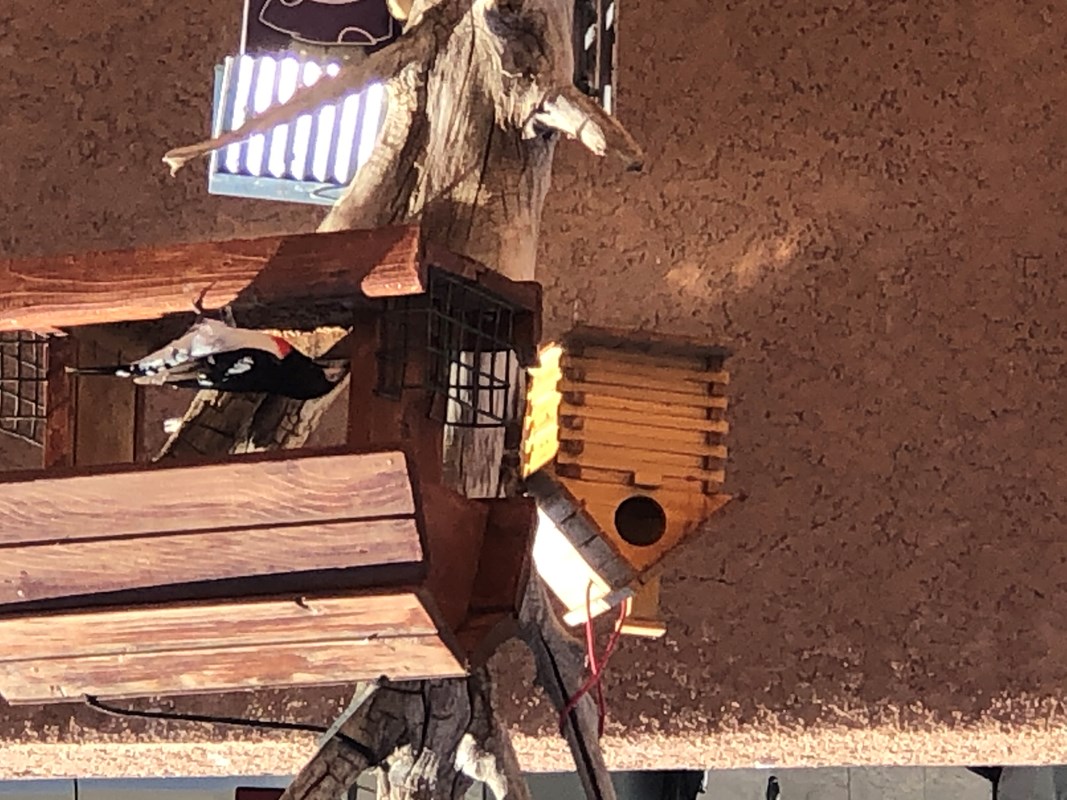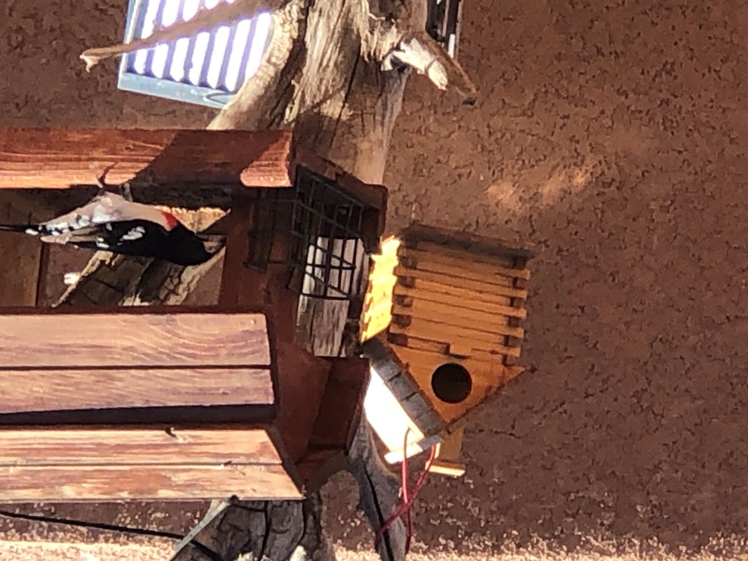 First landed on the patio wall, then flew to one of several birdfeeders. It fed from the birdfeeder then flew away when it was frightened by a noise on the porch.