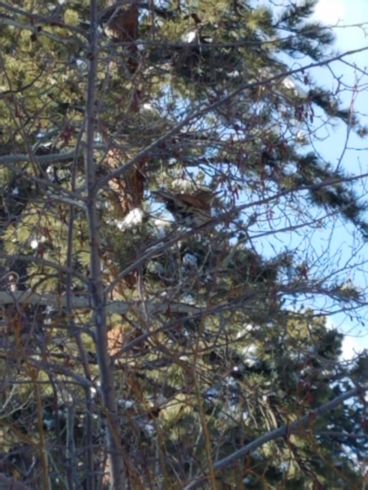 I have known the Brown Thrasher from long ago, also hermit thrushes. I am 94 and have belonged to CFO forever. The address is that of my helper and husband. They have been seeing it almost daily. Chatfield was my study area, before moving to Coal Creek Canyon - the trasher was seen there a few times. There is a video Renae made - not sure we can send it.