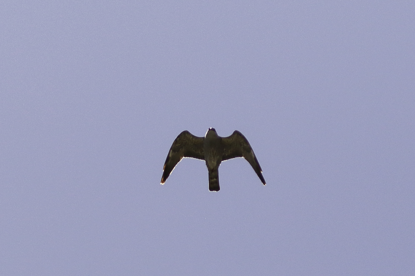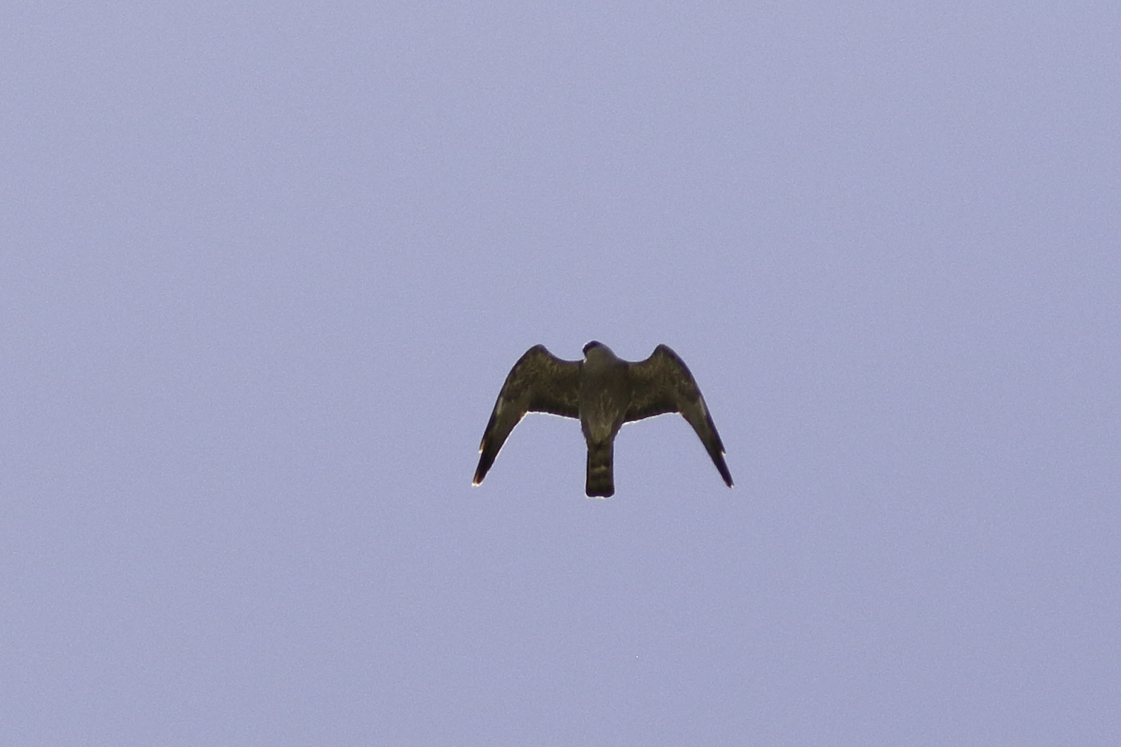 We were sitting on the porch when I noticed a falcon-like bird in a glide to my left. Using binoculars I was not immediately able to identify it as we were looking toward the sun angle. The bird turn toward us, remaining in a glide, and even more into the glare so I began taking what photos I could due to severe backlighting, making direct observation difficult. The entire observation time was approximately 20 seconds and the bird was never observed to flap in that time. It sailed over us at perhaps 100 feet high and disappeared from view. At the time we easily ruled out PEFA due to a number of things including lack of a mustache. The bird's size and shape easily ruled out AMKE. At the time I was assuming it must have been a PRFA and the photos would be defining. However, I took several days to process the photos and once I looked at them I ruled out all falcons and arrived at an ID of a MIKI. The face and throat were whitish. The breast and belly a muddy gray-brown color with paler vent. The primaries were dark and P10 was very much shorter than the longest primaries with a clearly defined white patch at the base. The trailing edge of the secondaries was dark. The underwing was mottled brown-gray with no obvious banding or other marks. The tail was dark with narrower pale horizontal bands. I actually had to ponder the photo a bit before it struck me as a MIKI. I have fairly extensive experience with the birds in Virginia and reviewed my own photos (historic) as well as several references to feel solid in the identification. The bird was not heard to vocalize. Based on plumage this is an immature bird - I don't see any obvious signs of primary molt and presume this bird to be a year old and of an age group known to wander.