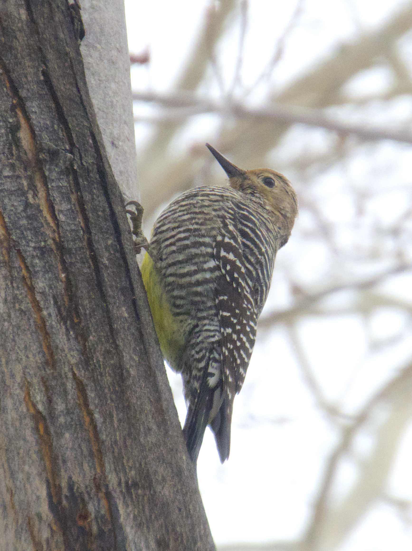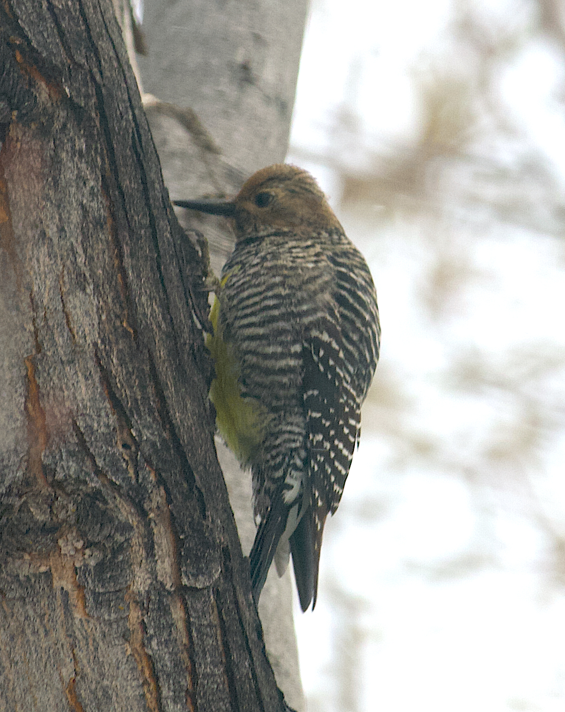 A woodpecker that was slightly smaller in size than an American Robin. Four toes total. Back was heavily barred with black and white. Sides also barred with black and white. Belly/underside yellow. Upper breast was black and white barred. Head was brown with no black and white and no red patches. Bill was dark and length was about the size of head. Dark eye.