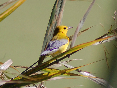 See photos. Bright yellow warbler, gray wings, white undertail coverts, large black eye, with bright yellow head.