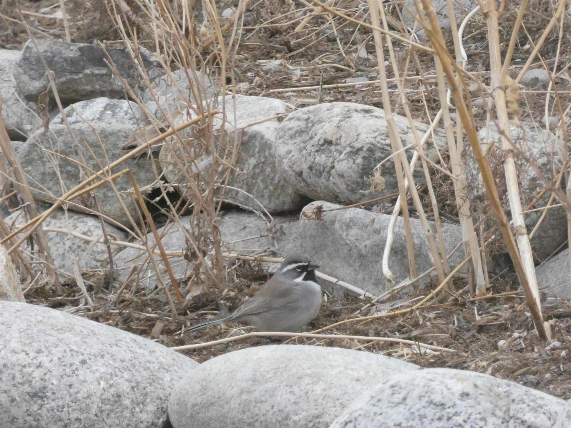 The bird clearly showed the distinctive face markings of black throat, dark gray mask bordered by white and partial white eye ring. Otherwise the bird was gray throughout, with darker gray/brown tinge on the back, slightly lighter breast/belly and some white bordering the v-shaped black throat.