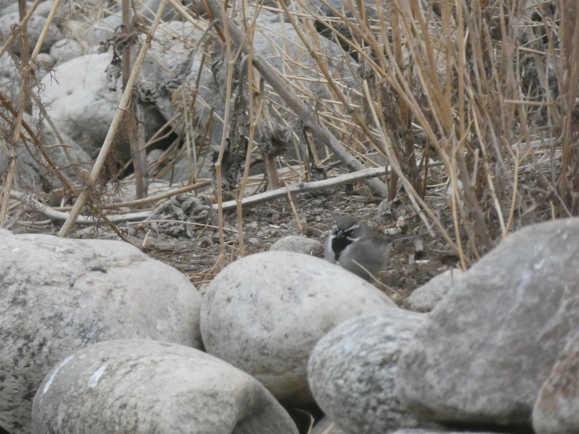 The bird was associating with a flock of House Sparrows. Since I was observing from inside through closed windows I would not hear any vocalizations. The bird was primarily foraging on the ground along the manmade berm of grasses and small bushes interspersed with rock. It would occasionally fly off with the HOSP to the road edge of other dried grass and then return. On a couple occasions it came out into the open and once flew up to the water bath. On other days, Abby had seen it pecking at mixed seed she dispersed on the ground within a few feet of the house but I didn't observe that.