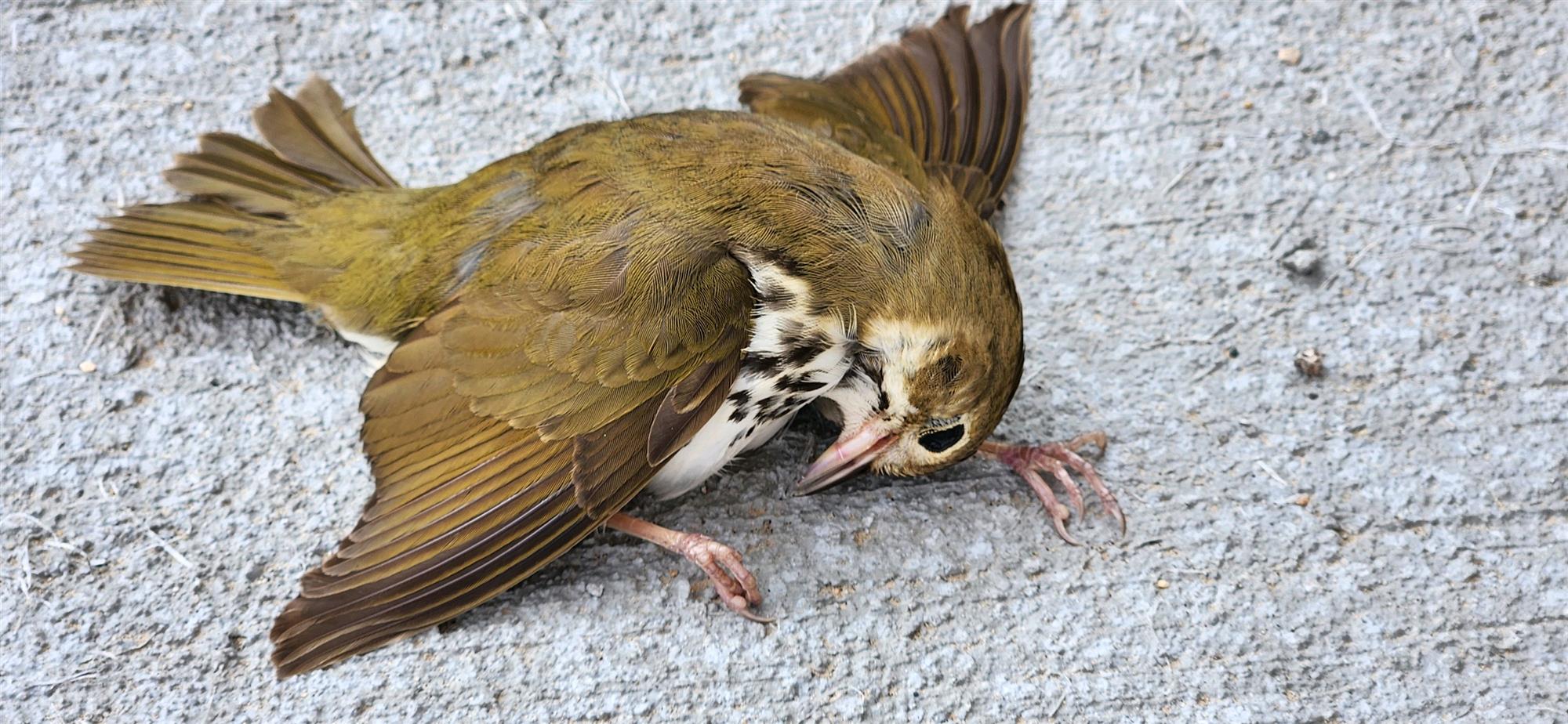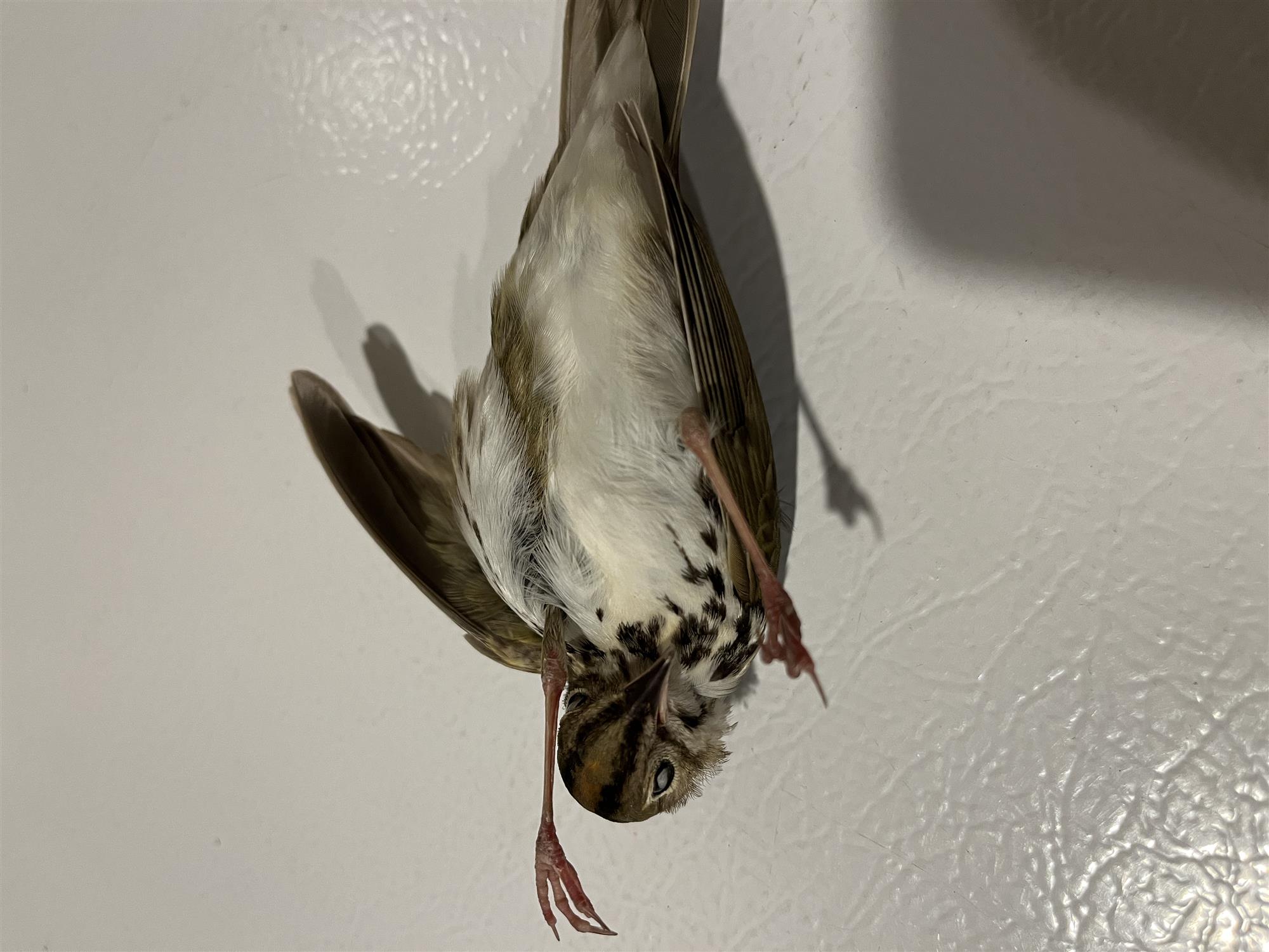 Rufous crown outlined in black; large brown breast spotting; olive back and wings.