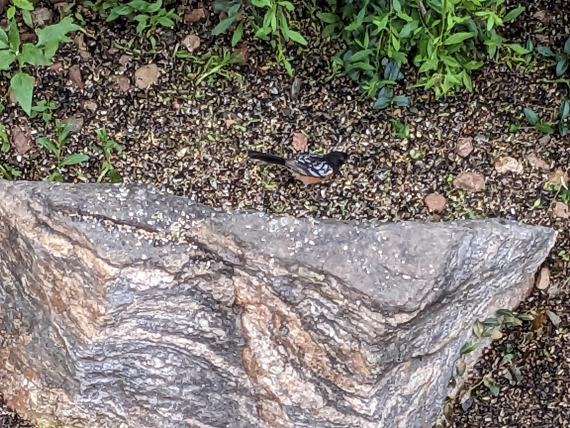 Feeding under my bird feeder. Used curious jumping/scratching under feeder to find seeds. Third or fourth time I've seen him. Black back with white banding. Orange breast and long tail. Definitely NOT a robin.