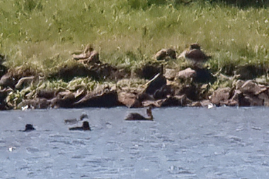 On July 13th we were told by Valentina Roumi that there were 2 RNGRs on the lake. We relocated one swimming and one on what appeared to be a mound/nest. When we returned on July 28th, we viewed one adult swimming with and feeding three juveniles. Sex was indeterminable. The adult was in breeding plumage (red neck with silvery chin/cheek patch) and the juveniles were the same medium shade of brown throughout. Dagger shaped bill was distinct but it was difficult to determine the color of the bills.