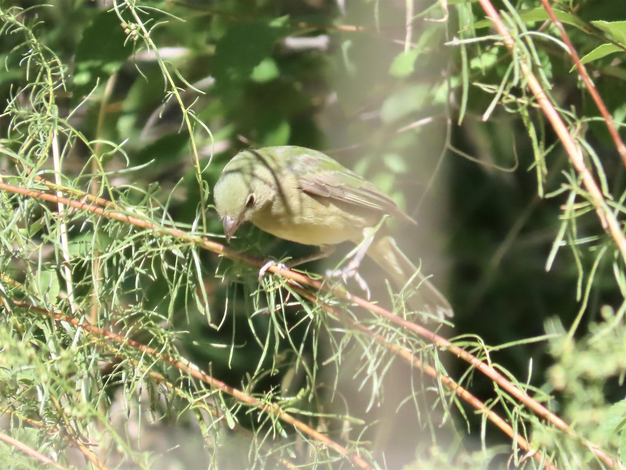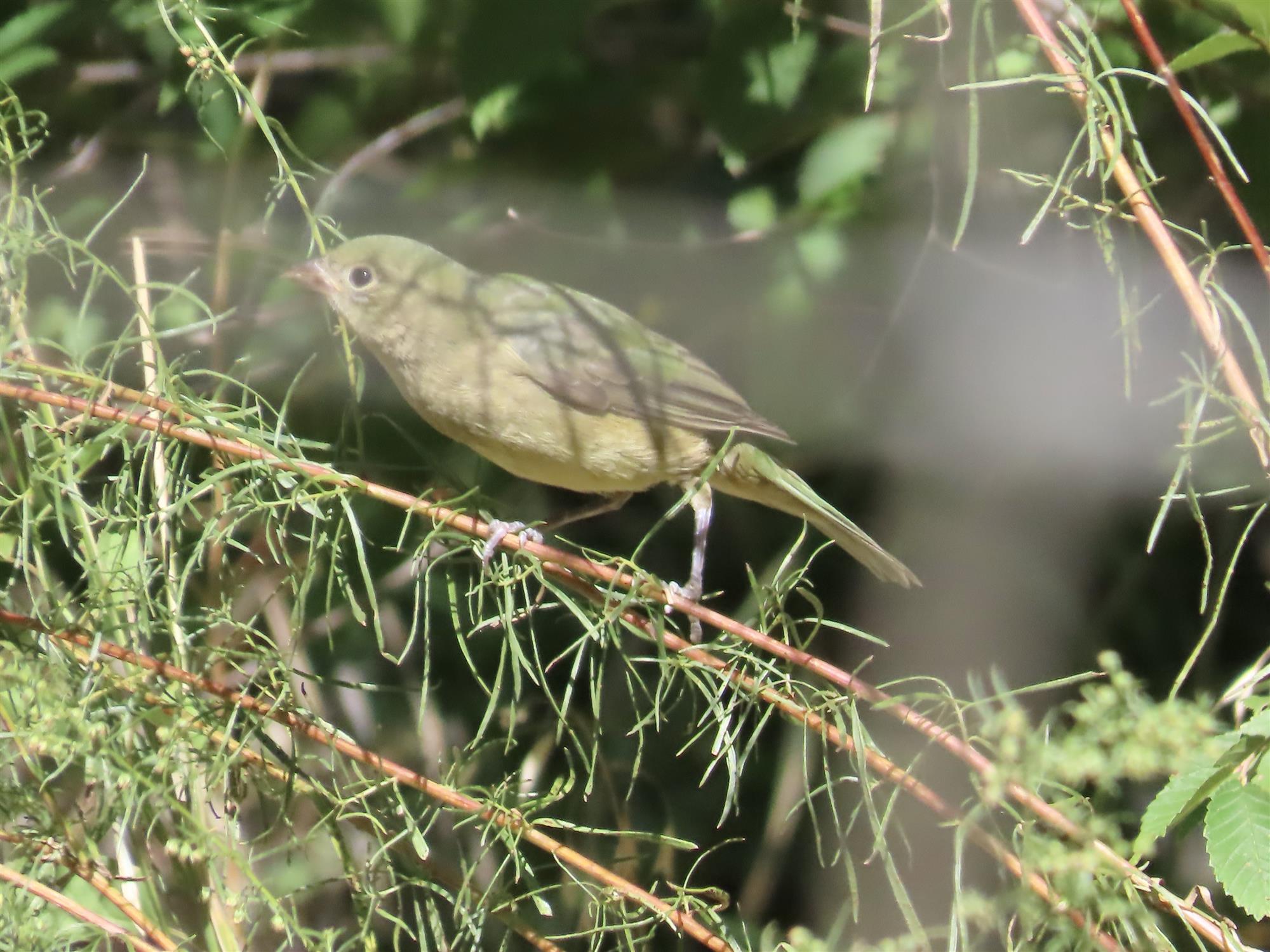 John Roser first spotted a small bird with a green back coming out of tall grass and flying into the low part of a shrub. Carol Comeau took photos. We both instantly recognized the bird as a female/immature Painted Bunting. The bird had a fairly bright green back and greenish/yellow undersides. There were no wingbars or other obvious markings other than a pale eyering. The bird had a fairly light colored bill. See photos. The bord continued foraging low in the shrubs. We never saw it more than 3 ft off the gorund. At one point it did perch on the fence surrounding the yard it was in. Ebiord report: https://ebird.org/checklist/S195102459