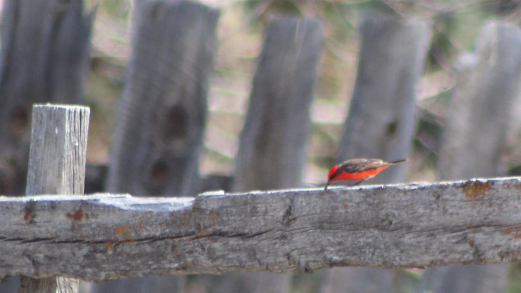 This beautiful bright red male bird had a black mask extending from the bill through the eye to blend in with the black back, wings and tail. The bird was seen flycatching and also plucked a caterpillar from the ground, banging it against the fence several times and then consuming it. This was the only vermilion flycatcher seen, and we didn't hear him vocalize.