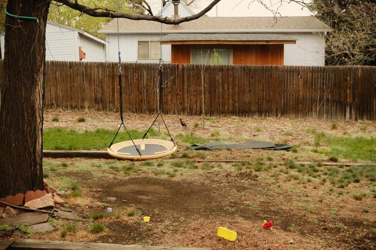 Urban back yard, wood chip mulch, grass.