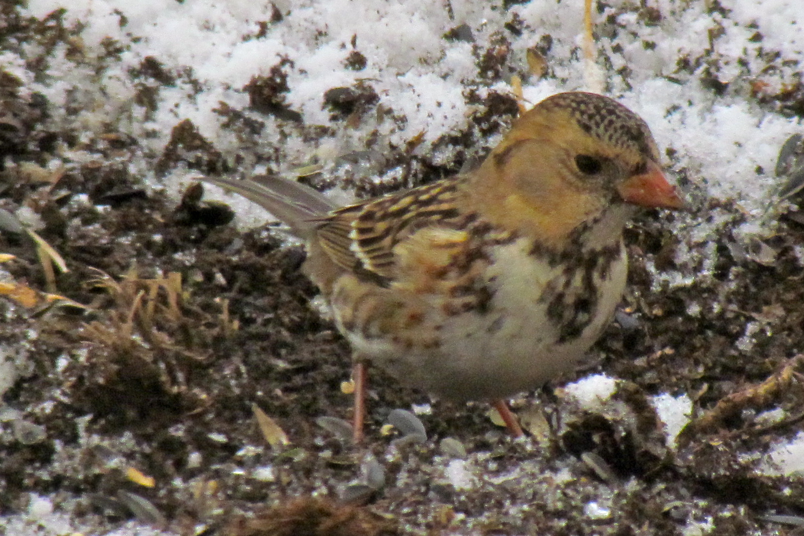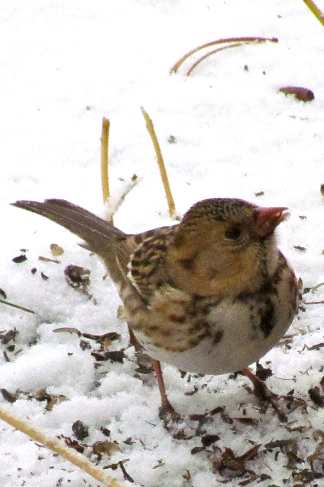 Very large sparrow. Brown spotted head with white chin triangle. Pink Bill, white belly. Small inverted well defined spotted "V" on breast. White wing bars.