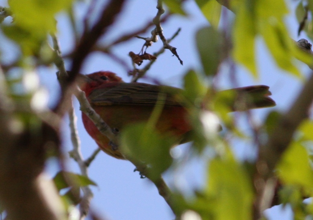 Structure and size and red coloring leaves us with just Hepatic Tanager, Summer Tanager, and Scarlet Tanager (lack of wing bars eliminates Western Tanager).