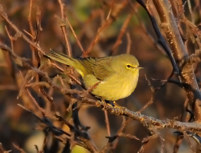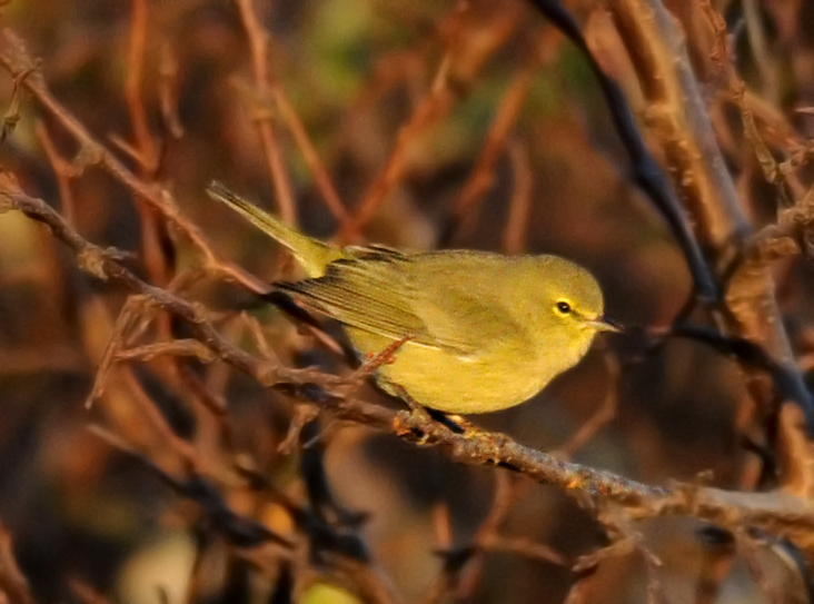 About an hour after sunrise, I was pishing at some low bushes. Several towhees and many sparrows had popped up. Among that collection, the appearance of a bright yellow bird startled me. Realizing that this was an unusually bright Orange-crowned Warbler, I snapped my camera up and began taking photos. After 30 seconds or so, the bird dropped down, I put down my camera, and resumed pishing. The bird reappeared much closer, at about 15-20 feet, in bright shade, where I was able to study it through Swarovski EL 10x42 bins for about 1 minute.