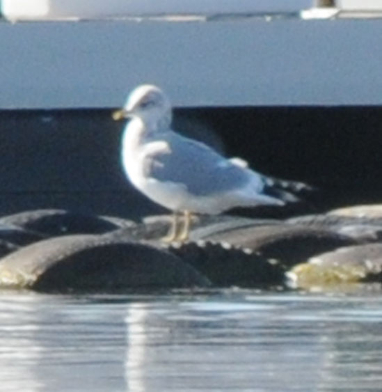 Ring-billed Gull was eliminated by the small, think solid yellow bill (lacked a black ring or any other marking) and very large white tertial crescent. Although the eye and mantle coloration were consistent with Mew Gull, I felt like the lighting conditions may have been too harsh and the distance too great to be definitive.