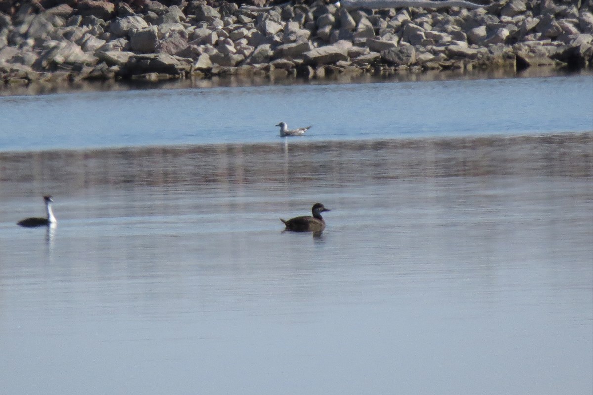 Overall gray with dark cap and pale cheeks and thin bill. Tail erect. Do not think the bird was dark enough to be adult female.