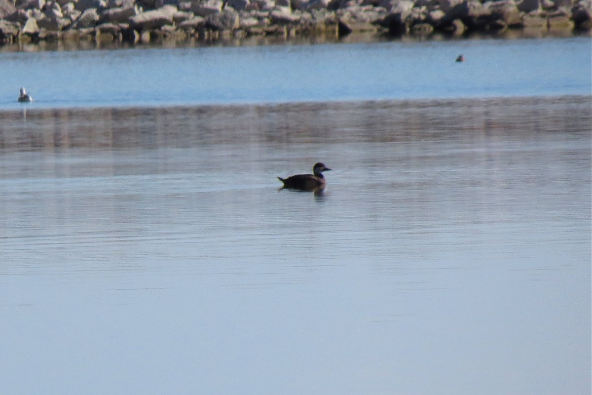 Eliminate from other scoters due to shorter thinner bill. Lack of vertical white patch that and dark eye eliminated Surf Scoter. Lack of white lores and white secondaries eliminated White-winged Scoter.