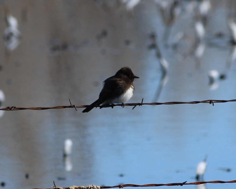 This bird was sparrow-sized about 6-7 inches in length. It was perched on a barbed wire fence and was sallying out to catch insects. Then it would return to the same perch. The bird was entirely black except for a starkly contrasting white belly and undertail. It had a black head, breast, neck, back, tail and feet. Eye and bill were black. I watched the bird and took photographs for about 15 minutes.