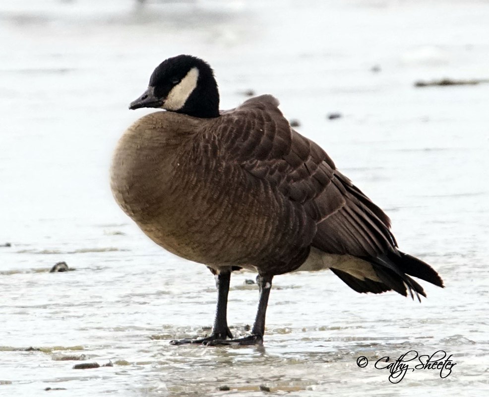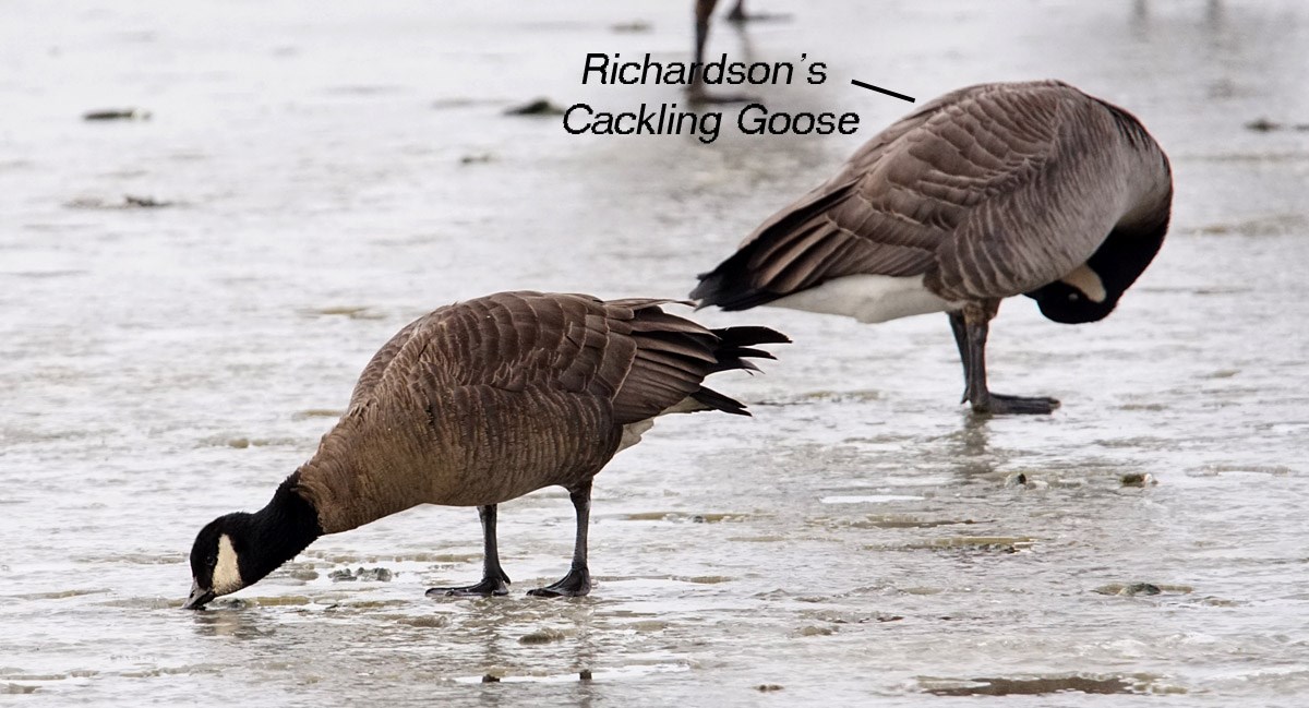 I initially noticed this bird for its very small size and darker chest color than the nearby Richardson's Cackling Geese. The bird was a fairly uniform dark brown, the chest also dark brown, but with a bit of sheen to it. The head was small and round in shape and the bill exceptionally stubby and small. The bird, itself, seemed at least 25% (or more) smaller than the Richardson's that were nearby. It was not very active in the time that I watched it, getting a drink once and the rest of the time mostly resting or sleeping with its head up. Through out this duration the head shape never varied from round. The uniform dark tone to the bird and slight variation in belly feather pattern seemed to suggest a first winter bird, rather than an adult.
