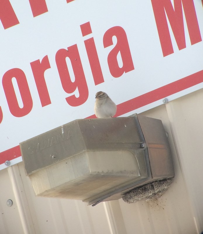 Looks like photos of first winter chipping sparrows, rufous crown with fine black streaks, rich cream superciliary line and wing bar pair, some dark gray color in upper mandible, no detectible malar stripe, black eye-line passed through broken whitish eyering and continues faintly in lores; cheek patch dusky-colored; throat white, smooth gray side neck, very pale buff breast, whitish belly; back rich straw-colored with dark streaks; In the 16 degree fahrenheit weather, it was catching bugs warmed by the sun reflecting off the Georgia Mesa Fire Station door.