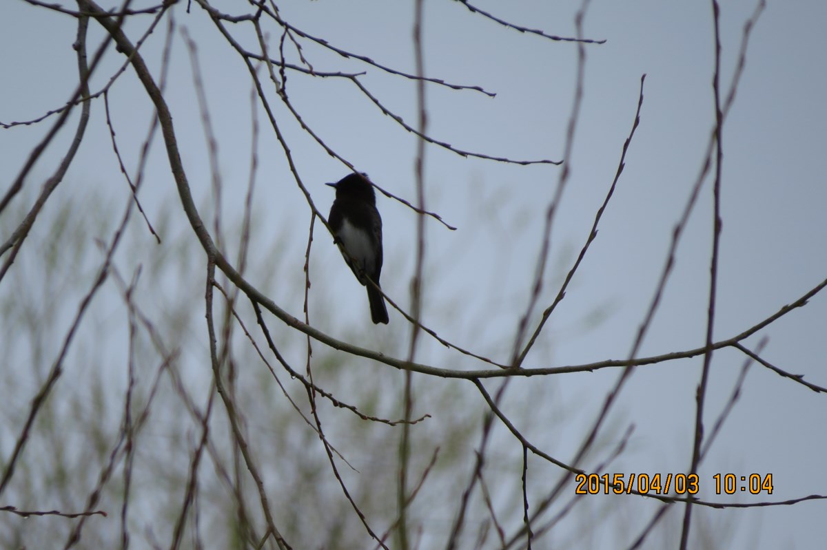 Phoebe-sized flycatcher; erect, tail-pumping, active. Feeding close to and even in the water; tail-dipping; both sang and called. Interacted extensively with an Eastern Phoebe, apparently a female, including visiting a nest site.