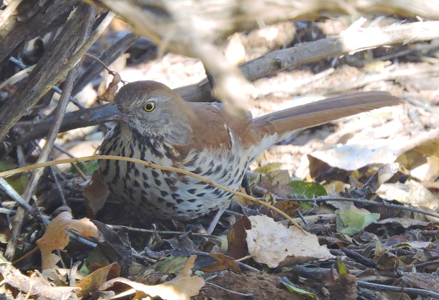 bird was clearly seen and photographed: rich reddish-brown upper parts, heavily streaked breast, black on white, pale yellow eyes, strong bill.