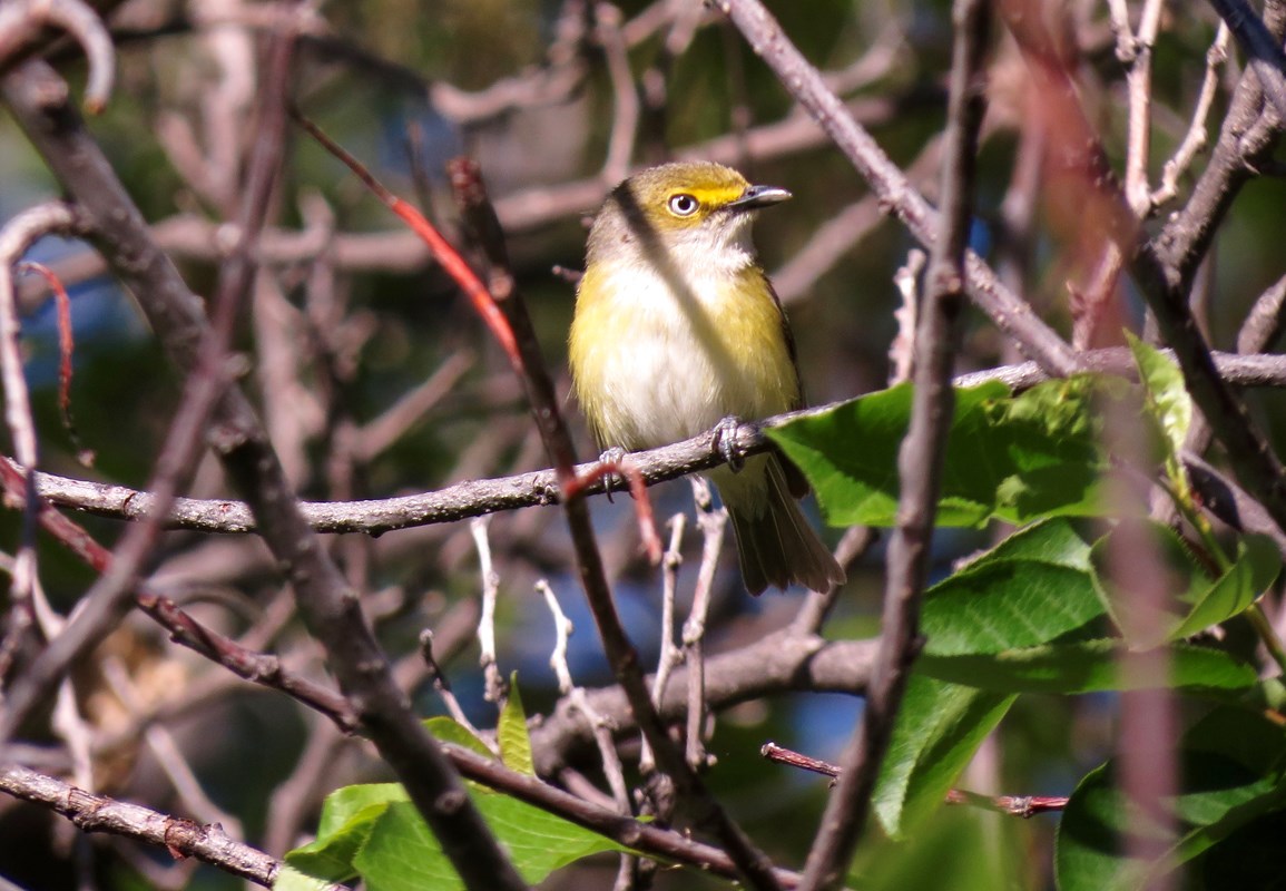 Bird was small, around 5 inches. Drab grayish olive overall. Had bright yellow spectacles which COMPLETELY SURROUNDED THE EYE, and diagnostic WHITE IRIS. Whitish throat, pale yellow flanks, gray nape. Bill appeared thick, and slightly hooked, top of upper mandible appeared dark, bottom half of upper mandible and lower mandible appeared pale gray. Alternately very active and also sat and called repeatedly. Call was tik-a-purrreer-chik.