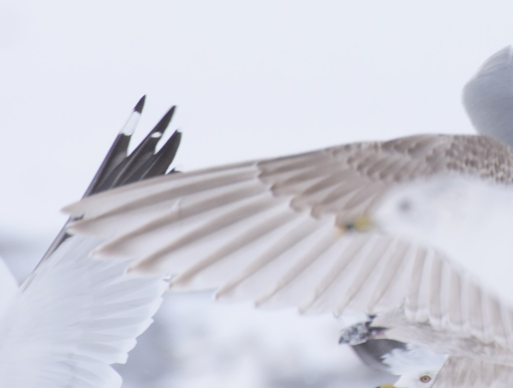 This bird fits in well with mainstream Iceland (Kumlien's) Gull as determined by looking at photos in Howell and Dunn's "Gull Book" and by scanning pics from Canada's Maritime Provinces and New England. That P10 is distinctly paler than P9 and P8 argues against THGU as does lack of a distinct secondary bar. The smaller size also favors ICGU as does the pallid tail. Per Bruce Mactavish: "That looks like a middle of the road Kumlien’s Gull. It would totally blend in with the common folk in St. John’s." ... With Kumlien's Gull being common and Thayer's quite rare in NFLD