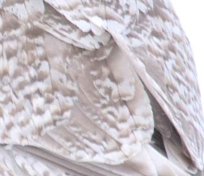 I first noted the gull standing on an area of flat ground close to, but not immediately near, area of dumping. It was obviously pallid compared to numerous other "brown" gulls nearby. The photos are accurate and give a better description than I can in words. Worth noting, in flight the wings appeared uniform (no secondary bar) except outermost primaries a bit darker than inner primaries, but similar in color to primary and secondary wing-coverts. The bird was smaller than surrounding gulls, including a THGU immature, with petite bill and head. Bird with very speckled appearance, the wing coverts being about 1/2 marked and 1/2 solid pale brown. The tail was solid, but pale, same color as wing-coverts and back. Rump appeared paler due to white barring mixed in with brown.