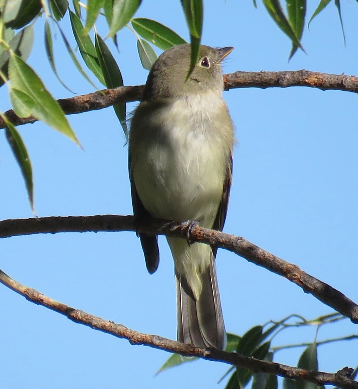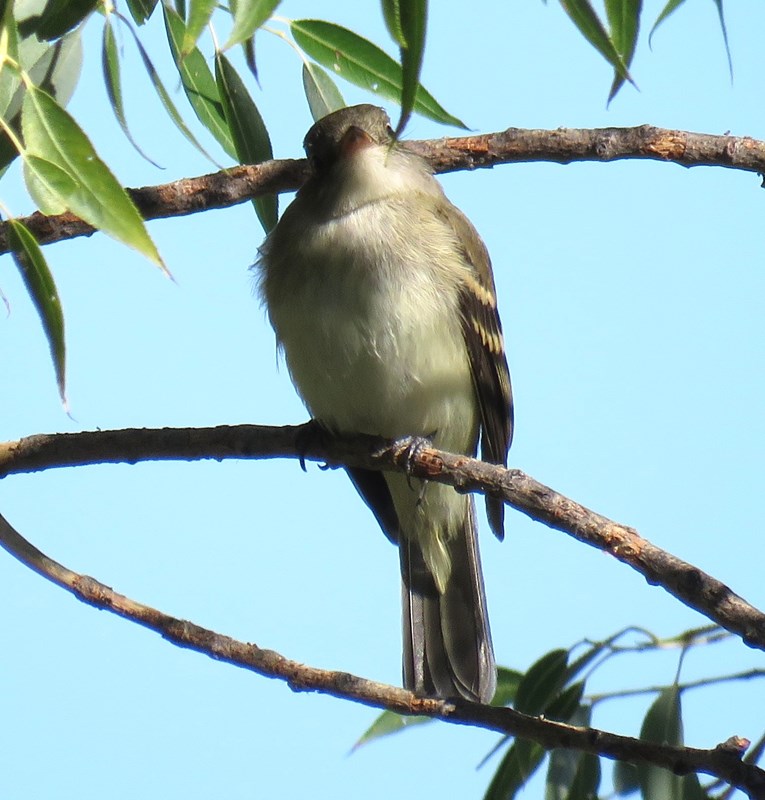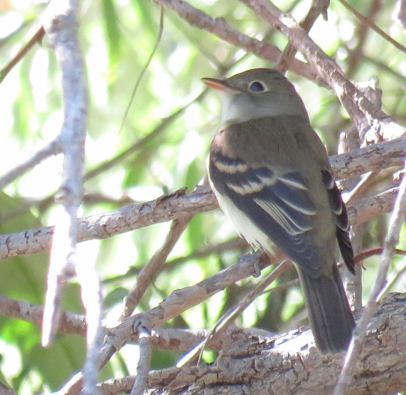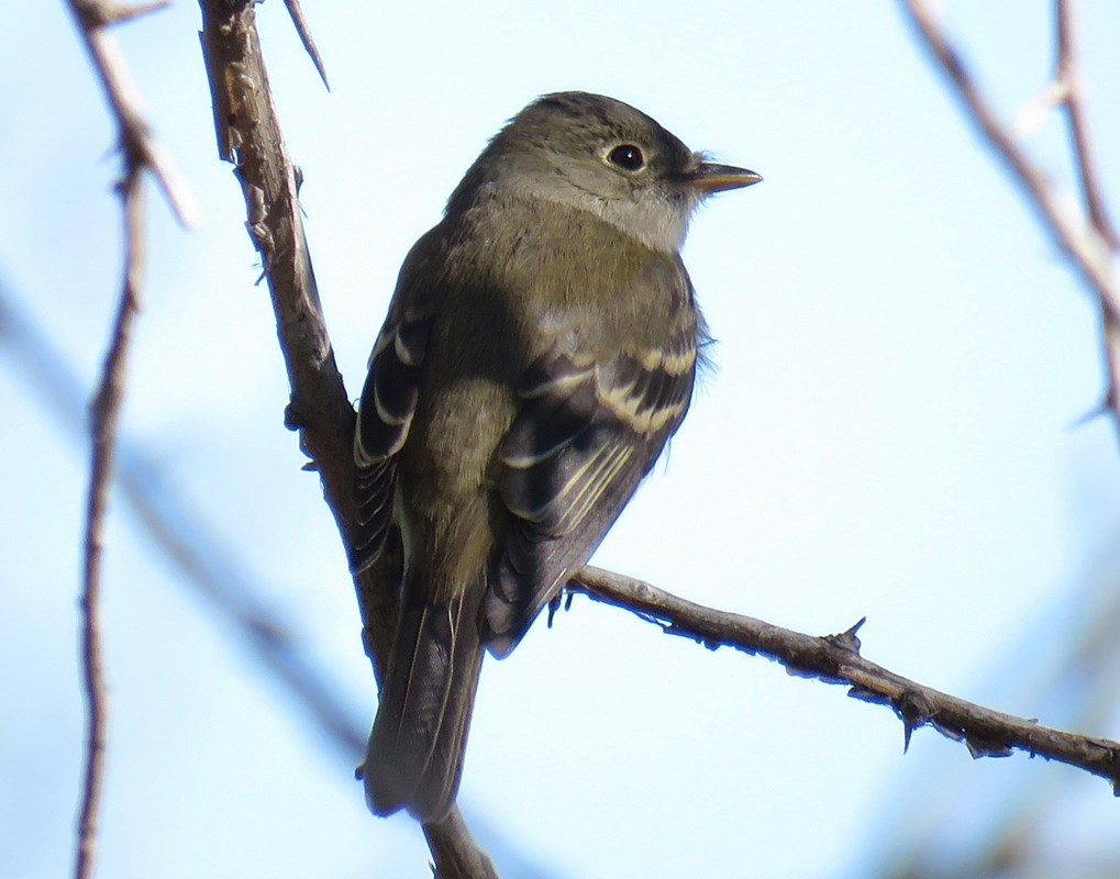 We observed the bird, clearly an empidonax flycatcher, on low perches for about 10 minutes. Observed characteristics were relatively bulky appearance for an empid; wide tail; olive back; long primary projection; high-contrast white and yellowish-white edges on tertials and secondaries; yellow/buffy wingbars (suggestive of a first-year bird); whiteish belly and flanks (little or no yellow apparent); slight gray wash on breast; white throat; grayish face; thick bill, dark on top and pale on bottom; and complete, narrow eyering. The attached photos are representative of what we saw through binoculars. One exception is that the eyering appears wider in some of the photos than it did in the field, as is often the case.