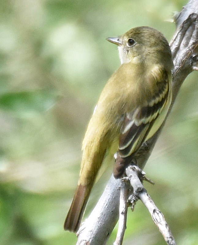 Largish Empidonax with green upperparts including crown. Wings quite contrasty. Tertials black centered with white edges. Wing coverts black centered with bright, white or near-white edging (wingbars). Secondaries edged with yellow-green. Throat white, contrasting sharply with gray-green auriculars. Weak round eyering. Rounded head throughout observation. Moderately long primaries. Bill smallish c/w eastern WIFL. Tail moderate length, relatively broad, square-ended.