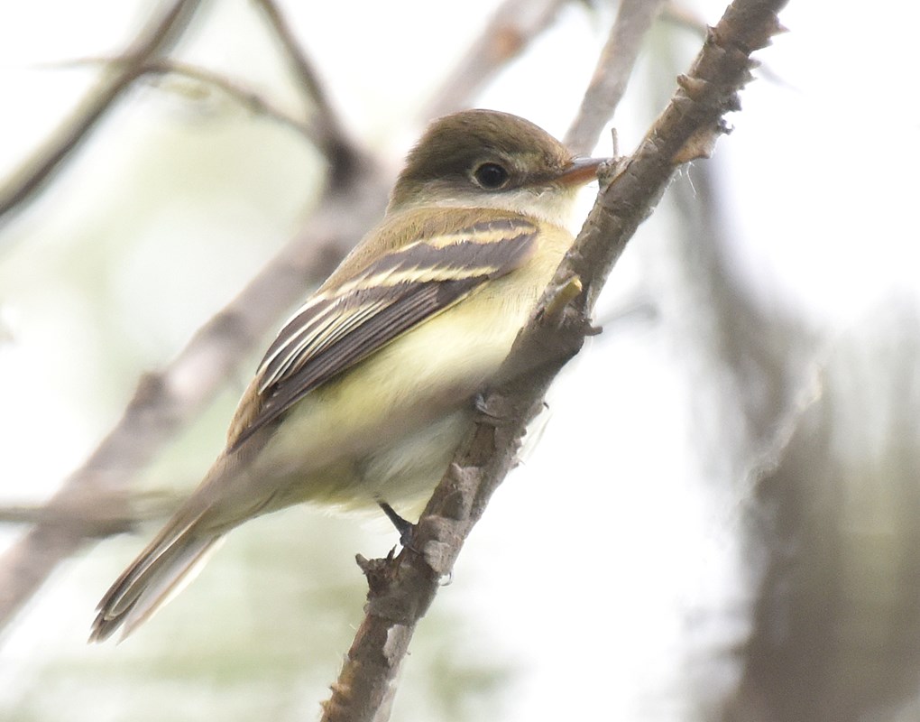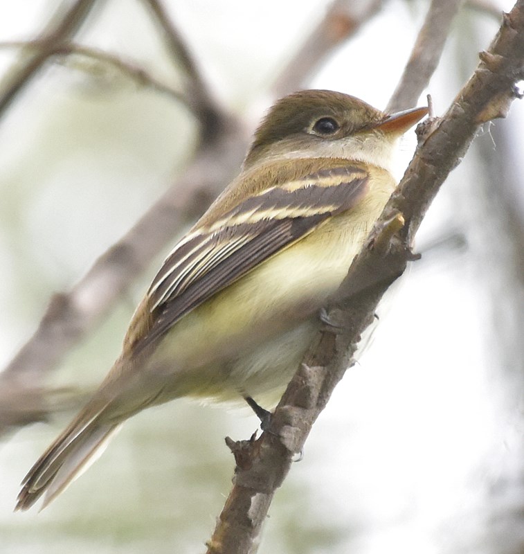 Upper parts green washed with brown. Wing-feathers blackish with broad and bright buffy edges to wing coverts (ie, wing-bars), bright white edges to tertials and greenish edging to secondaries. Auriculars green washed in gray. Very narrow white eyering. Vaguely grayish lores. Throat white, sharply contrasting with auriculars. Head somewhat rounded, never crested looking. Primary projection moderately long. Shape otherwise simiilar to Traill's Flycatcher group as a whole, though bill on smallish side. Call a loud Pip to Peep.